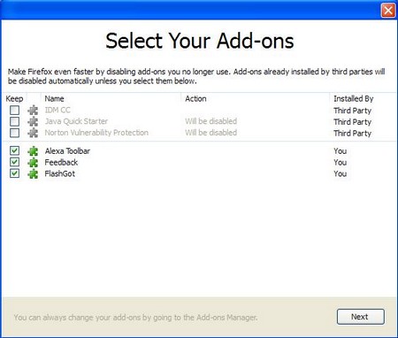 Có thể dễ dàng nhận ra điều này khi lần đầu tiên cài đặt và sử dụng Firefox 8, 1 hộp thoại hiện ra cho phép người dùng chọn các add-on tương ứng để sử dụng trên Firefox 8. Đặc biệt, trong đó, mặc định các add-on được cài đặt do bên thứ 3 (tự động cài đặt thêm trong quá trình cài đặt phần mềm) sẽ bị Firefox 8 vô hiệu hóa, người dùng có thể chọn để cài đặt thêm các add-on này cho Firefox 8 nếu muốn.